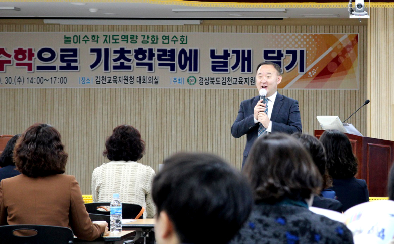 김천교육지원청(교육장 마숙자)은 지난달 30일 교육지원청 대회의실에서 관내 초등교원 70여명을 대상으로 '놀이수학 지도 역량강화 연수회'를 개최했다.