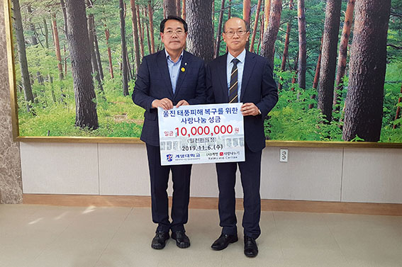 지난 6일 김용일 계명대 학생부총장은 울진군을 방문, 전찬걸 울진군수를 만난 자리에서 지난달 발생한 태풍 '미탁'으로 큰 피해를 입은 이재민에게 사용해 달라며 복구 성금 1000만원을 전달했다.