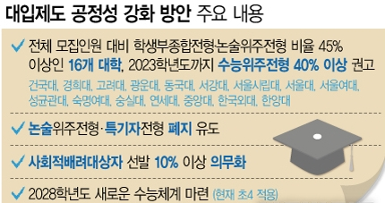 교육부가 이른바 SKY 대학을 비롯해 서울 소재 16개 대학을 대상으로 현재 중학교 3학년이 입시를 치르는 2023학년도까지 대학수학능력시험(수능) 위주의 정시모집 비중을 40% 이상 확대하도록 권고하기로 했다. 수시 학생부종합전형(학종)이나 논술위주 전형 쏠림이 모집인원 45% 이상을 차지하는 대학이 대상이다. 서울대와 고려대, 연세대를 비롯해 ▲건국대 ▲경희대 ▲광운대 ▲동국대 ▲서강대 ▲서울시립대 ▲서울여대 ▲성균관대 ▲숙명여대 ▲숭실대 ▲중앙대 ▲한국외대 ▲한양대 등이 포함됐다. 부모 영향력이 작용한다는 지적을 받고 있는 학교생활기록부(학생부) 비교과영역과 자기소개서는 2024년 완전히 폐지하고, 면접은 물론 서류평가까지 블라인드 평가를 확대한다. ◇정시 40% 이상 제시…국고사업 연계 유도 유은혜 사회부총리 겸 교육부 장관은 28일 오전 10시 정부서울청사에서 이 같은 내용의 '대입제도 공정성 강화 방안'을 발표했다. 정시 확대는 올해 559억원이 투입된 국고사업 고교교육기여대학지원사업과 연계해 확대를 유도한다. 교육부는 현재 고등학교 1학년이 대입을 치르는 2022학년도에도 정시전형 40% 이상을 적용하도록 조기달성을 유도하기 위해 예산 증액을 추진하고 있다. 정시 확대 비율로 '40% 이상'을 제시한 이유는 지난해 2022학년도 대입제도 공론화 당시 국가교육회의권고내용을 참고했다고 교육부는 밝혔다. 당시 국가교육회의는 "시민참여단 응답자 평균적으로 적절하다고 본 수능 비율을 약 39.6%였다"며 교육부에 정시 확대를 권고했다. SKY 등 서울 16개 대학이 수능위주 정시전형을 40%까지 늘릴 경우 정시로 대학에 가게 될 학생 수는 2021학년도 기준 1만4787명에서 2만412명으로 5625명(38%) 늘어나게 된다.  교육부는 특히 16개 대학이 자율형사립고(자사고)나 특수목적고(특목고) 등 외부 영향력이 컸던 논술전형과 특기자전형을 폐지하고 정시전형을 확대할 수 있도록 유도할 방침이다. 논술전형은 올해 1만1162명(3.21%), 특기자 전형은 3935명(1.13%) 수준이다. 16개 대학 중 서울대는 학종 비율이 78%로 가장 높았으며, 연세대는 학종과 논술 비율이 59%, 고려대는 학종 47.5%를 차지했다. 학종 비율이 가장 낮은 한국외대는 46%였으며, 서울시립대는 46.2% 수준이었다. 학종으로 100% 선발하는 포항공대는 학종실태조사 대상으로도 분류됐지만 지역 대학이라는 이유로 빠졌다.서울대, 고려대, 서울시립대, 숭실대, 서울여대 등 5개 대학을 제외한 11개 대학은 논술 전형으로 10% 이상 선발하고 있기 때문에 2년에 걸쳐 이를 정시로 확대할 수 있다. 그러나 논술 전형을 운영하지 않는 서울대와 고려대의 경우 학종 또는 학생부교과전형을 줄여야 하는 상황이다. 교육부는 중·장기적으로는 미래교육을 담아낼 새로운 수능체계를 마련하기로 했다. 고교학점제는 현재 초등 4학년이 고등학교에 진학하는 2025학년도에 전면 시행된다. 기존과는 전혀 다른 교육을 받기 때문에 평가방식과 입시도 변경돼야 하는 상황이다. 교육부는 이들이 대학에 진학하는 2028학년도부터는 논술·서술형 문항을 도입하거나, 국제 바칼로레아(International baccalaureate)로 변형하는 등의 방식을 검토한다. 교육부는 내년까지 정책연구를 통해 이번 정부 내에 관련 시안을 내놓기로 했다.