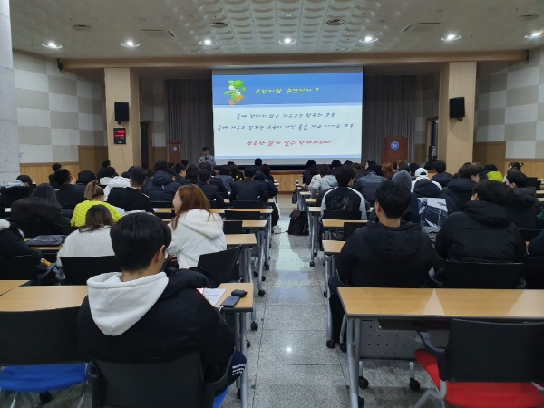 대구공업대가 지난달 28일 강당에서 교양교육센터 주관 재학생 대상 인성·교육 특강을 펼쳤다.이번 특강은 '나에게 영감을 불어넣어 교감의 장을 만들자!'란 주제로 진행됐다.이 대학 사회복지경영계열 이원주 교수가 강사로 나서 자신의 파악을 통해 행복한 학창시절을 만들고 세상을 보는 지혜와 공감을 위한 대화의 방법을 강의했다.