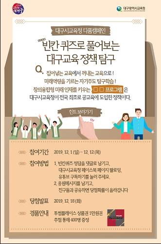 대구시교육청은 오는 12일까지 시교육청 SNS 7개 채널을 연계한 블로그를 통해 대구교육정책을 탐구하며 이해하는 ‘다품캠페인 빈칸퀴즈 이벤트’를 진행한다. 올해 처음 시행된 ‘다품캠페인’은 착한교복, 학교공간혁신, 수능응원메시지 등 대구교육의 주요 정책과 이슈를 홍보하면서 시민들의 관심과 참여를 높이기 위해 연말까지 4회에 걸쳐 마련한 퀴즈형식의 응원 댓글 이벤트다. 연말 대미를 장식할 네 번째 이벤트는 유튜브와 페이스북 페이지에 게시된 빈칸퀴즈 정답을 댓글로 남기면 채널별로 정답자 중 200명을 추첨해서 소정의 온라인상품권을 증정하는 행사다. 이번 퀴즈 주제는 대구교육청이 전국 최초로 공교육에 도입한 창의융합형 미래인재를 기르는 국제바칼로레아(IB) 프로그램으로 정답 힌트는 시교육청 유튜브와 페이스북 페이지에 링크된 영상을 통해 누구나 쉽게 얻을 수 있다. 힌트 영상은 아이들이 질문에 대답하려고 손을 드는 수업장면을 시작으로 ▲집어넣는 교육에서 꺼내는 교육으로 ▲미래역량을 기르는 탐구형 자기주도학습 ▲학생의 변화와 성장을 돕는 미래교육 ▲IB가 창의융합형 미래 인재를 기릅니다 등의 자막과 함께 관련 이미지가 차례로 이어진다. 대구교육청은 내년부터 유튜브방송, 카드뉴스 등 특화된 쌍방향 소통채널로 교육수요자의 관심과 참여를 유도할 계획이다.