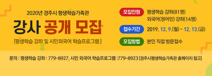 경주시평생학습가족관은 ‘2020년 평생학습 정규강좌 운영’을 위해 함께할 강사를 공개 모집한다고 8일 밝혔다.