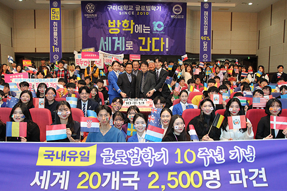국내 유일 '글로벌학기'- 2010년부터 '방학에는 세계로 간다' 구미대학교(총장 정창주)가 국내 대학 최초로 방학기간을 국제경쟁력 강화를 위한 '글로벌학기'로 선포한지 올해로 10주년을 맞았다. 구미대의 '방학에는 세계로 간다'는 슬로건을 내건 글로벌학기는 2010년부터 하계와 동계로 나눠 연 2회 실시해 왔다.