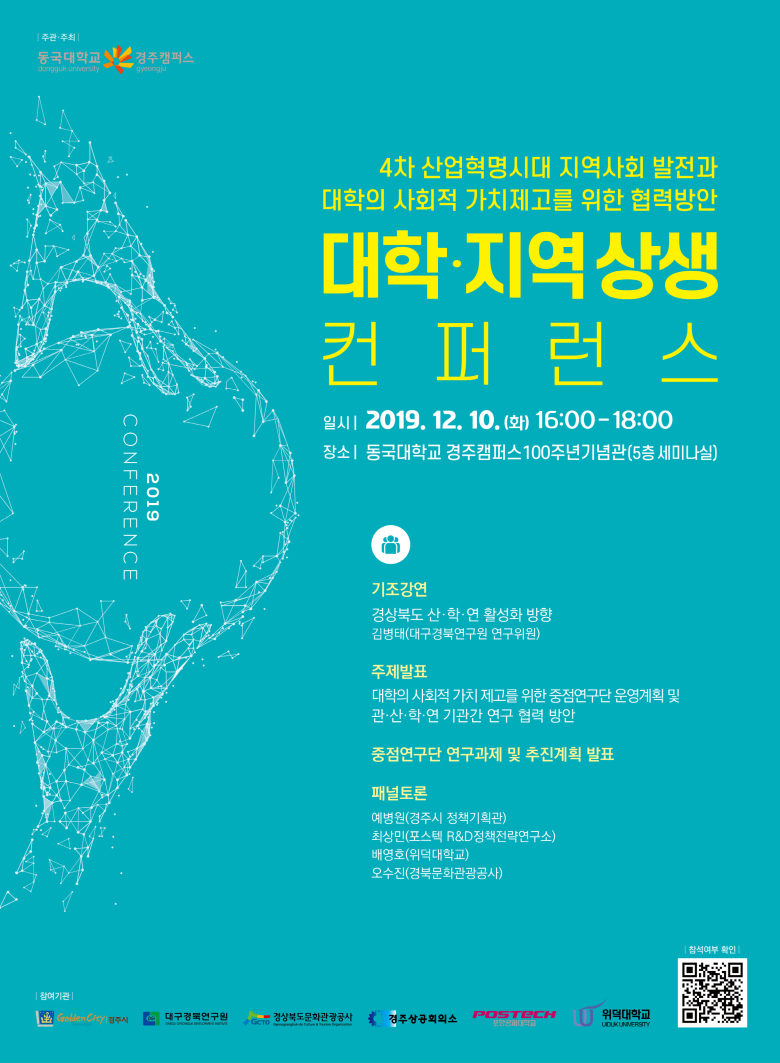 동국대학교 경주캠퍼스는 오는 10일 100주년기념관에서 “4차 산업혁명 시대 지역사회 발전과 대학의 사회적 가치 제고를 위한 협력방안”을 주제로 ‘대학·지역 상생 컨퍼런스’를 개최한다.이번 컨퍼런스는 관산·학·연 공동연구 플랫폼 구성을 통해 지역사회 발전과 대학의 사회적 가치 제고 방안을 모색하기 위해 개최된 것이다.컨퍼런스는 김병태 대구경북연구원 연구위원의 ‘경상북도 산학연 활성화 방향’에 대한 기조 강연을 시작으로 ▲대학의 사회적 가치 제고를 위한 동국대 경주캠퍼스 중점연구단과 관·산·학·연 기관 간 연구 협력 방안 발표 ▲경주시, 포스텍, 위덕대, 경북문화관광공사 관계자 등이 참여하는 패널토론 순으로 진행된다.문태수 동국대학교 경주캠퍼스 기획처장은 “이번 컨퍼런스는 지역의 당면과제 해결을 위해 대학의 연구자들과 각 분야 전문가들의 다양한 의견을 수렴해 중장기적인 지역 문제해결 협력방안을 모색하는 기회가 될 것”이라며 “지역 내 민·관·산·학·연 기관이 참여하는 실질적인 협의체가 구성되길 기대하고 있다”고 말했다.