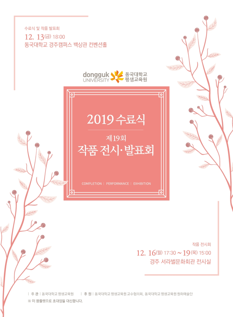 동국대학교 경주캠퍼스 평생교육원은 13일 오후 6시 교내 백상관 컨벤션홀에서 ‘2019학년도 평생교육원 수료식 및 발표회’를 개최하는 한편, 오는 16일부터 19일까지 4일간은 경주 서라벌문화회관 전시실에서 ‘2019학년도 제19회 수강생 작품 전시회’를 가진다고 밝혔다.이번 수료식 및 작품 발표?전시회는 동국대학교 경주캠퍼스 평생교육원 정규과정 수강생들이 1년간 학습하고 연마한 작품을 발표·전시하는 행사로 평생교육원에서 운영하는 뮤직아카데미, 미술창작과정 등 25개 과목에서 총 225명의 수강생이 참여하고, 6개의 공연과 213점의 전시품이 전시된다.작품 전시회는 16일 오후 6시 테이프 커팅식을 시작으로 12월 19일 오후 15시까지 개최된다.허상현 동국대 경주캠퍼스 평생교육원장은 “이번 수료식 및 발표, 전시회를 통해 지역사회 평생교육의 장인 동국대 경주캠퍼스 평생교육원을 널리 알릴 수 있는 계기가 되었으면 한다. 며 “앞으로 경주지역 시민과 평생교육 학습자에게 더 좋은 프로그램을 제공할 수 있도록 노력하겠다”고 말했다.한편 동국대 경주캠퍼스 평생교육원은 1998년 2월에 설립되어 지역민과 지역사회에 평생교육의 장으로서 평생교육 및 지역사회 봉사의 역할을 담당하고 있으며, 2019학년도 일반학습과정 80여 개의 강좌와 학점은행제 사회복지사, 청소년지도사, 보육교사 과정이 개설되어 1000여 명이 강좌를 수강하고 있다.