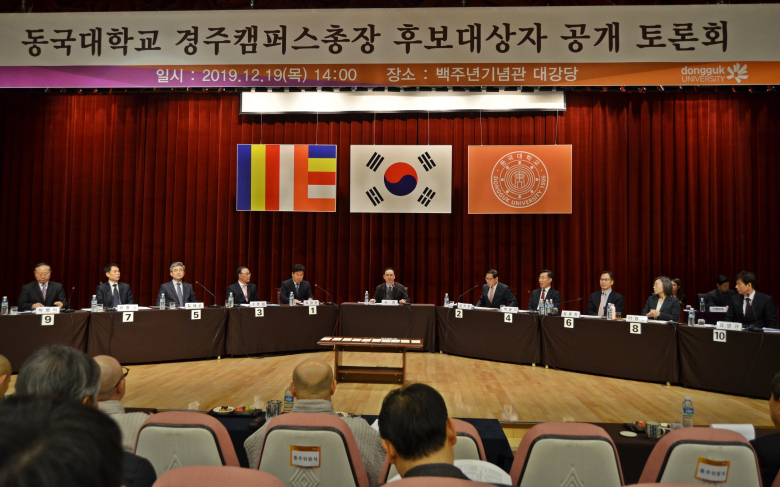 동국대학교 경주캠퍼스가 개교 이래 처음으로 총장 선거에 도전한 후보들에게 향후 4년간 동국을 이끌어갈 운영기조와 핵심전략 등을 들어보는 공개 토론의 자리를 마련했다.동국대 경주총장후보자추천위원회(이하 총추위)는 19일 동국대 경주캠퍼스 백주년기념관 대강당에서 ‘총장 후보대상자 공개토론회’를 개최했다. 이날 공개토론회는 최봉석 동국대 법학과 교수의 사회로 모두발언과 토론, 마무리 발언의 순으로 진행됐다. 모두발언은 당일 추첨을 통해 류완하, 김의창, 구본철, 박용기, 김세곤, 김흥회, 신흥묵, 이영경, 박병식, 김영규 후보 순으로 진행됐다. 모두발언 순으로 후보 1인이 무작위로 하나의 주제를 선택해 발언한 후 해당 주제에 관심 있는 다른 후보가 의견을 개진하는 식으로 진행됐다.먼저 류완하 교수는 “경주캠퍼스의 장점인 불교, 역사 및 문화 중심의 새로운 ‘지역혁신’을 도모하고, 학문간 협업이 이루어질 수 있는 융합전공·학과 등의 지속가능하고 미래지향적인 ‘교육혁신’을 개척해 나갈 것”이라고 밝혔다.이어 김의창 교수는 “미래 신산업과 지역협력 기반의 국책사업 수주를 위해 산학협력 및 연구지원을 위한 물적·인적 인프라를 대폭 확충하고, 평가보상시스템을 확고히 하겠다”고 말했다. 또 구본철 교수는 “경주캠퍼스의 특성화 학문분야에 교내연구비로 지원해 수준을 높인 다음 국책사업 수주에 적극 참여할 계획”이라며 “경북도와 경주시, 포항시가 추진하는 정책방향은 경주캠퍼스가 강점을 가진 학문 분야와 일치하는 만큼 지자체와 상생적 협력관계를 구축해 정책과제를 선점해야 한다”고 강조했다.박용기 교수는 “연구와 산학역량 향상을 통해 정부연구비 수주를 확대하겠다”며 “빅데이터를 활용한 전주기 관리, 연구자 중심 연구지원 시스템 구축을 비롯해 인센티브와 교내연구비 지원을 확대하겠다”고 밝혔다. 김세곤 교수는 “외국인 유학생 유치와 영남불자 동국후원단 조직화로 연간 120억원을 확보하고 이를 기반으로 연구·교육환경의 획기적인 변화를 가져오겠다”며 “재정확보 및 지역협력의 일환으로 경주시의 왕경복원사업, 도시재생사업에도 참여하겠다”고 말했다.김흥회 교수는 “교수들이 행정 지원에 시간을 뺏기지 않도록 행정업무를 효율화하고 행정직원을 충원하겠다”며 “이와 함께 교수들의 연구 활동이 활성화도록 대학 내 연구소를 재편하고 지원제도도 복원하겠다”고 말했다.신흥묵 교수는 “연구환경과 교육환경은 연구혁신과 재정건전성을 강화함으로써 발전적인 변화를 가져올 수 있다”며 “AI와 인문·사회, 예술 간 융합연구 수행, 연구자 중심 연구지원 체계 구축, 의·한·생명·공학 융합연구센터 신설, 지자체 협력기반 구축 등으로 연구혁신을 촉진시키겠다”고 말했다.이영경 교수는 “교원의 연구환경 강화는 단기적인 성과보다는 연구와 강의의 질적 지속성을 담보하기 위한 실질적 제도개선을 통해 이뤄진다”며 “경주캠퍼스의 현실에 부합하도록 성과평가제도를 현실화하고 교육과 연구 영역간의 유연성을 확보하겠다”고 말했다.박병식 교수는 “교수의 연구활동을 지원하는 ‘자료분석지원센터’를 설립해 연구활동과 연구과제 수행에 전념할 수 있도록 하겠다”며 “지역 중소기업에 대한 연구소 기능을 수행할 수 있도록 연구인력의 확보와 연구과제 수주도 관리하겠다”고 말했다. 김영규 교수는 “대학의 생존이 화두가 된 지금, 경주캠퍼스는 각종 국책사업에 실패하면서 현재 교육부의 대학기본역량진단에만 목을 매고 있는 상황”이라며 “위기를 기회로 만들기 위해서는 기본으로 돌아가야 한다”고 말했다.한편 이날 공개토론회에 참가한 후보들은 모두 “지방소재 대학이라는 한계와 입학자원 감소라는 위기상황에 직면해 있다고 진단”하면서 “종립대학으로서의 정체성 확립으로 차별화를 꾀하고, 지역 연계 등을 통해 대학경쟁력을 강화하는 한편, 학생 수급 및 학교발전을 위해 연구·교육환경을 개선하겠다”고 한 목소리를 냈다.