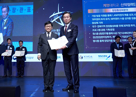 계명대학교는 지난 10일 서울 얄재동 엘타워에서 열린 '2019 벤처창업진흥 유공 포상 시상식'에서 중소벤처기업장관상을 수상했다고 지난 24일 밝혔다.'2019 벤처창업진흥 유공 포상 시상식'은 대한민국 혁신 성장의 주역인 우수 벤처기업과 창업 기업을 발굴하고 격려하기 위해 중소벤처기업부가 주최하는 행사다.계명대의 이번 수상은 산학협력단의 창업지원단이 창업지업 육성의 공로를 인정받아 이뤄졌다.계명대는 1998년 중소기업청 대구∙경북 창업보육센터 지정을 시작으로 지금까지 지역 창업기업의 역량확대와 지역창업인프라 조성, 청년창업자교육 확대 등 창업의 전반적인 분야에서 다양한 역할을 수행하며 지역 거점 창업기관으로 성장해 왔다. 지금까지 3000여 개의 기업을 발굴해 육성해 왔다.김한수 계명대 창업지원단장은 "대구∙경북의 창업지원 거점기관으로 4차 산업혁명 관련 기술기업과 지역 중점 육성산업 기업들의 성공적 창업을 지속적으로 지원해 지역 경제 활성화 및 고용창출에 기여하는 역할을 충실히 수행해 나갈 예정이다"고 말했다.