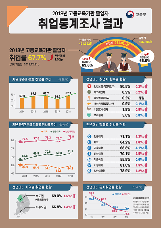이번 조사 대상은 전국 4년제 일반대학과 교육대학, 산업대학, 각종학교, 기능대학, 일반대학원의 2018년 2월과 2017년 8월 졸업자 55만5808명이다. 2018년 12월31일 기준 취업·진학 현황을 파악하기 위해 국민건강보험공간, 국세청, 고용노동부, 병무청, 한국산업인력공단 등 공공 데이터베이스(DB)를 활용했다.