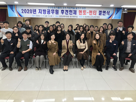 김천교육지원청은 지난 17일 김천교육지원청 대회의실에서 신규 공직자 17명과 선배 공직자 17명간 멘토-멘티 결연식을 개최했다.이날 가진 멘토-멘티 결연식은 새내기 공직자의 조직 적응력을 높이고 선배 공직자의 자기성찰을 통한 건전한 조직문화 확산을 위해 실시하게 됐다. 이를 계기로 주기적인 모임을 가져 교육행정인의 기본소양, 실무교육 등 신규 공직자의 조직생활 적응에 실질적인 도움을 줄 수 있는 기회를 제공했다.이날 결연식은 멘토-멘티 선서, 교육장 격려 메시지와 함께 멘토-멘티 대화의 시간 순으로 진행하며 멘토링 활동에 대한 서로의 포부와 다짐을 말하며 뜻깊은 시간을 가졌다.마숙자 교육장은 “자신이 처음 걷는 길은 후임자들에게 길이 된다는 말처럼 새내기 공무원들은 첫출발을 계기로 모범이 되는 공직자가 되고, 선·후배간 소통을 통해 함께하는 행복 김천교육을 만들자”고 당부했다.