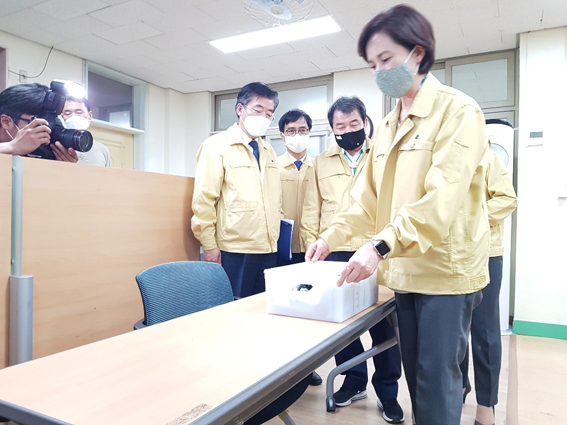 유은혜 부총리 겸 교육부 장관과 송기동 부교육감이 6일 김천여자고등학교를 방문해 등교 개학 준비상황을 점검하고, 학교 내 코로나19 대응 모의훈련을 참관했다.