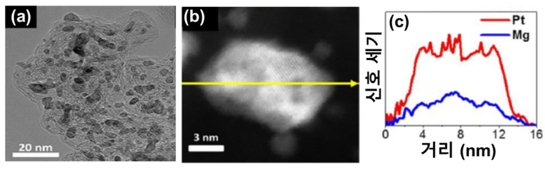 국내연구진이 친환경 차세대 발전기술로 주목받고 있는 수소연료전지 성능을 높인 신개념 전극 촉매 대량합성법을 개발했다.대구경북과학기술원(이하 DGIST)이 에너지공학전공 유종성 교수 연구팀이 기존의 백금 연료전지 촉매보다 안정성이 더욱 향상된 신개념 전극 촉매 개발에 성공했다고 24일 밝혔다.연구팀에 따르면 수소연료전지는 수소를 공기 중의 산소와 반응시켜 전기를 생산하는데 주로 백금이 전극 촉매로 사용된다. 하지만 연료전지가격의 40% 이상을 차지하는 백금의 비싼 가격과 낮은 안정성으로 대량생산이 쉽지 않은 실정이다. 이 때문에 백금 함량을 낮추면서 성능 좋은 촉매의 합금 소재를 찾기 위해 각국에서 다양한 연구를 진행 중이다. 그 중 전이금속 전이금속인 니켈, 코발트는 백금과 합금화한 연료전지 촉매로 사용 시 활성이 높아 현재까지도 합금 소재로 많이 쓰인다. 하지만 전이금속의 특성 상 높은 전압과 산성 상태에 취약해서 쉽게 산화되는 탈 합금 현상이 발생해 안정성이 떨어지는 단점이 있다.연구팀은 지각 내 존재량이 풍부한 알칼리 토금속인 마그네슘의 낮은 녹는점과 전자구조적 특성에 주목했고, 백금과 결합하면 높은 안정성을 가진 합금 촉매가 제작 가능할 것이라 판단했다. 마그네슘의 쉽게 산화되는 특성 때문에 백금과의 합성이 어려운 점을 해결하기 위해 마그네슘 금속을 전구체 전구체로 사용하는 합성법을 고안했다. 이를 위해 백금염이 담지된 탄소 담지체와 마그네슘 금속 파우더를 섞은 후, 수소/아르곤 혼합가스에서 650도의 고온 열처리를 진행했다. 이 때 마그네슘 금속이 녹아 백금염과 혼합되면서 백금-마그네슘 합금 촉매가 완성됐다.