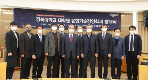 경북대가 대구·경북 최초로 대학원 융합기술경영학과를 개설하고, 지난 7일 경북대 본관에서 발대식을 개최했다.이날 발대식에는 홍원화 경북대 총장을 비롯해 김태운 대구시 일자리투자국장, 강기원 한국산업기술평가관리원 혁신성장사업본부장, 박일우 한국로봇산업진흥원 혁신지원사업단장, 권대수 대구테크노파크 원장, 이재일 대구창조경제혁신센터장 등이 참석했다.경북대가 지난 6월 ‘융합기술사업화확산형 전문인력양성사업’ 선정되면서 신설된 융합기술경영학과는 산업통상자원부로부터 5년간 약 24억원을 지원받아 기술과 경영을 겸비한 융합기술 사업화 인재를 양성하게 된다.융합기술경영학과는 대학원 석사과정(정원 30명)으로, 경영학과를 중심으로 융합기술 분야 4개 학과(인공지능, 의생명융합공학, 로봇 및 스마트시스템공학, 수소 및 신재생에너지)와 법학과가 협동․운영한다. 이와 함께 한국산업기술평가관리원, 한국로봇산업진흥원, 대구테크노파크, 대구창조경제혁신센터 등 지역 혁신기관들이 참여기관으로서 학과 운영과 취업 및 기술사업화에 협력할 예정이다. 경북대가 기초 이론과목을 담당하며, 융합실무과목은 경북대와 참여 혁신기관과 기업이 함께 설계·운영하는 산·학·연 협동체제로 진행된다. 현재 2021학년도 1학기 신입생 모집 중이며, 원서접수는 11일까지다. 기업 재직자를 위해 주로 야간 및 주말 수업으로 운영되며, 다양한 장학혜택도 주어진다. 자세한 모집요강은 경북대 대학원 입학 홈페이지(https://ipsi2.knu.ac.kr)에서 확인할 수 있다. 사업단장인 조성표 경북대 교수는 “이공계 학도에게는 경영·회계·경제·법을, 인문사회학도에게는 기술과 산업을 교육하는 융합형 교육과정을 운영해 융합기술과 기술경영을 겸비한 미래형 인재를 양성하도록 하겠다”며 사업 포부를 밝혔다.