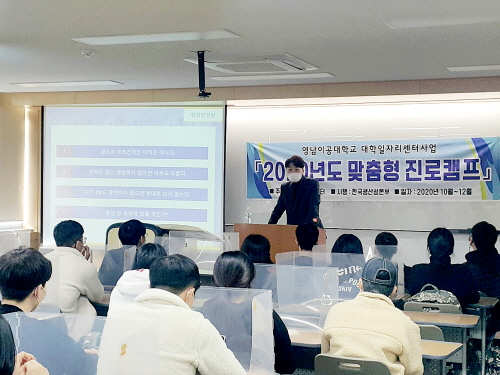영남이공대 YNC일자리센터가 1학년 재학생 1500여명을 대상으로 '2020년도 맞춤형 진로캠프'를 운영했다.11일 영남이공대에 따르면 올해 맞춤형 진로캠프는 지난 10월12일부터 12월11일까지 맞춤형 프로그램을 통해 학생들의 진로와 취업준비를 도왔다.현직에서 근무 중인 졸업생을 초청해 가진 선배초청 진로특강에선 재학생들의 전공과 관심 직무에 대한 실질적인 정보를 제공해 학생들에게 큰 호응을 얻었다.또 MBTI, 커리어로드맵 만들기(마인드 맵, 만다라트 기법), 진로설정 로드맵, 효율적 시간관리 특강 등으로 재학생들의 적성, 흥미, 가치관을 정확하게 알고 더 나아가 자신의 구체적인 진로탐색의 방향을 설정할 수 있도록 했다.치위생과 2학년 이빛나 학생은 "적성에 맞는 프로그램을 통해 진로를 설정하고 현장 실무 정보를 알게 돼 많은 도움이 됐다"면서 "캠프에서 배운 내용을 바탕으로 대학생활을 알차가 보내고 목표한 곳에 취업하도록 노력하겠다"고 말했다.