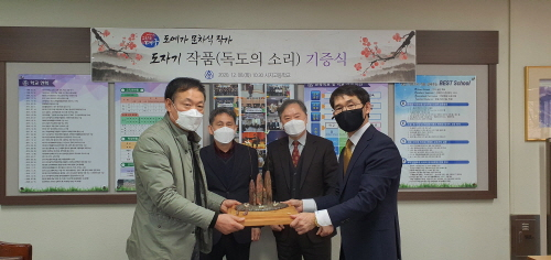 대구 시지고등학교(교장 서기수)가 독도 수호 의지를 위한 문차식 작가의 '독도 작품' 기증 프로젝트에 동행을 약속했다.시지고는 지난 8일 학교 교장실에서 '도예가 문차식 작가, 도자기 작품(독도의 소리) 기증식'을 진행했다.이날 기증식은 신종 코로나바이러스 감염증(코로나 19) 재확산으로 최소한의 인원이 참여한 가운데 진행됐다.기증식에서 서기수 시지고 교장은 독도 주권 인식의 필요성을 강조하며 학생들의 독도 주권 인식 함양에 힘을 보태기로 약속했다.서기수 교장은 "교육의 도시에서 독도 주권의 필요성을 알리는 교육을 외면한다는 건 교육의 본질을 외면하는 것과도 같다"면서 "다양한 프로그램을 통해 학생들의 독도 주권 인식 강화에 노력하겠다"고 말했다.문차식 작가는 "교육 명문 학군인 시지고가 독도 교육에 힘을 보태기로 약속해 감사한 마음"이라면서 "독도의 참교육이 실현되도록 서 교장과 많은 소통을 갖겠다"고 했다.