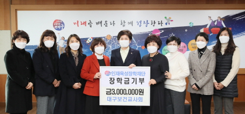 대구시교육청은 지난 15일 대구보건교사회가 코로나19로 어려움을 겪는 취약계층 학생들을 위해 장학금 300만원을 기탁했다고 16일 밝혔다.보건교사회는 지난 1999년 난치병 제자 돕기 성금 1400만원을 모금해 질병으로 고통받는 학생들을 도왔다. 또 매년 장애를 가진 어린이들이 생활하는 애망원 봉사를 통해 나이팅게일의 정신을 실천하고 있다.강은희 대구시교육감은 "기탁한 장학금은 힘든 시기를 함께 극복하는데 따뜻한 격려가 될 것"이라며 "학생들이 희망과 용기를 가지고 학업에 전념할 수 있도록 하겠다"고 말했다.