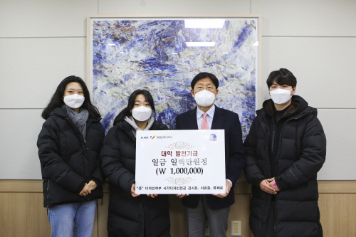 계명문화대 학생들이 대구 남구 캐릭터 디자인 공모전 수상금을 대학발전기금으로 기탁해 귀감이 되고 있다.이들 학생들은 지난 18일 총장실을 찾아 박승호 총장에게 상금 중 100만원을 후배들과 대학발전을 위해 사용해 달라며 기탁했다.김시온 학생은 "지도교수님과 대학의 아낌없는 지원으로 좋은 결과를 얻을 수 있었다. 대학에 도움이 되고자 기부를 결심하게 됐다"며 기탁 소감을 밝혔다.박승호 총장은 "1학년 학생들이 공모전에서 최고상을 받은 것도 자랑스러운데 이렇게 선뜻 발전기금을 기탁해 너무 대견하다"며 "후배들이 전문직업인으로 성장해 나가는데 밑거름이 되도록 소중하게 사용하겠다"고 말했다.