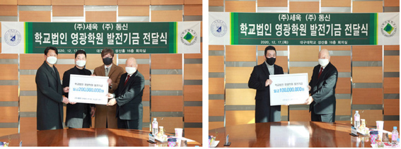 대구대학교 산학협력단 가족회사인 ㈜세욱(대표이사 전재욱)과 ㈜동신(대표이사 김도욱)이 학교법인 영광학원에 발전기금 2억원과 1억원을 각각 기탁했다.대구대는 지난 17일 경산캠퍼스에서 학교법인 영광학원 박윤흔 이사장, 대구대 김상호 총장, ㈜세욱 전재욱 대표이사, ㈜동신 김도욱 대표이사 등이 참석한 가운데 발전기금 전달식을 개최했다.특히 이날 전달식에는 ㈜세욱의 주요 주주인 삼성라이온스 오승환 선수와 권오준 선수(은퇴)가 참석해 눈길을 끌었다.이날 전달식에서 전재욱 ㈜세욱 대표이사는 “장애인 교육 등 지역사회 공헌에 앞장서고 있는 영광학원과 대구대에 발전기금을 기탁하게 된 것을 뜻깊게 생각한다”면서 “지역 대학과 기업이 함께 상생 발전하는 데 함께 힘을 모아 나가길 기대한다”고 말했다.