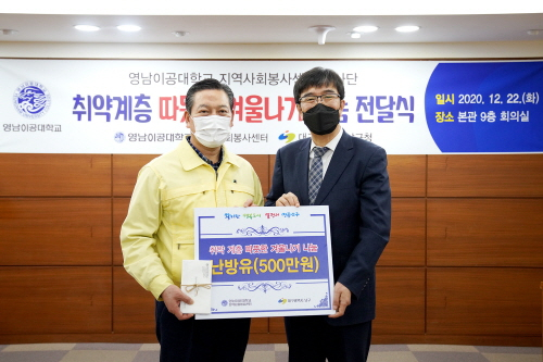 영남이공대가 지난 22일 본관 9층 회의실에서 지역 소외계층을 돕기 위한 '취약계층 따뜻한 겨울나기 나눔 전달식'을 가졌다.영남이공대 지역사회봉사센터 봉사단 주최로 열린 이번 전달식에는 영남이공대 박재훈 총장, 박찬규 부총장, 지역사회봉사센터 변혜선 센터장, 박준우 팀원, 정민규 봉사단 대표 학생, 조재구 대구 남구청장 등이 참석했다.영남이공대는 이번 행사를 통해 남구청에 500만원 상당의 난방유를 전달했다. 남구청은 선정된 취약계층에게 난방유를 이용할 수 있는 쿠폰을 전달할 계획이다.박재훈 총장은 "지속적인 나눔 호라동을 통해 지역사회와 상생 발전하고 남구의 대표이자 자랑이 되는 대학이 되도록 노력하겠다"고 했다.