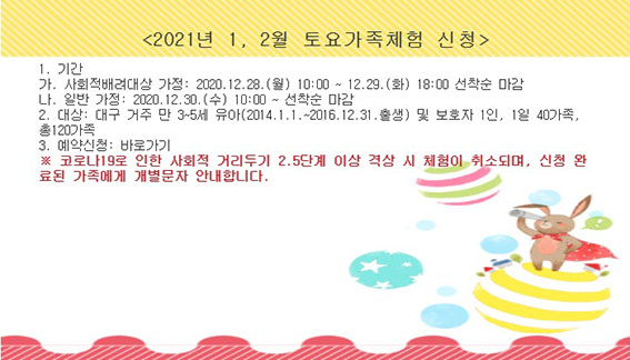 대구유아교육진흥원은 내달 1일 유아와 가족에게 놀이로 공감하고 소통하는 '1, 2월 토요가족체험'을 개최한다고 27일 밝혔다.이 프로그램은 창의관, 인성·대구관 중 1개관 체험 및 동요그림자극 '팥죽할머니와 호랑이' 공연 관람으로 구성됐다.체험신청은 진흥원 홈페이지(http://www.dge.go.kr/daegu-i)에서 선착순 모집한다. 사회적배려대상 가정은 오는 28일 오전 10시부터, 일반 가정은 오는 30일 오전 10시부터 각각 신청이 가능하다.김수연 원장은 "부모님과 함께 공감하고 소통하는 기회를 제공함으로 따뜻한 가족공동체 문화를 조성하는 기회가 될 것이다"고 말했다.