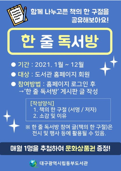 대구 동부도서관이 시민들과 공감하는 독서문화 조성을 위해 '한 줄 독서방'을 연중 운영한다.'한 줄 독서방'은 코로나19로 마음의 여유가 줄어드는 현실에서 나에게 감동을 준 도서의 한 구절을 공개 게시글로 작성해 시민들이 함께 나누고 서로를 위로하는 온라인 행사다.작년부터 시작한 이 행사는 책에 대한 흥미를 유발하고 독서에 대한 의욕을 북돋아주기 위해 기획됐다.대구 관내 도서관 홈페이지에 가입한 도서관 회원이면 누구나 참여 가능하며, 매월 추첨을 통해 1명에게 문화상품권을 증정할 예정이다.노경자 관장은 "몸도 마음도 힘든 요즘, 이번 행사를 통해 조금이나마 책으로 마음이 따뜻한 시간을 보내는 계기가 됐으면 한다"고 말했다.