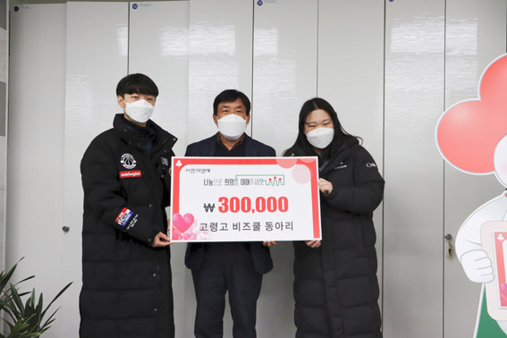 고령고등학교 비즈쿨동아리에서 지난 12일 고령군청을 방문해 사랑의 대가야희망플러스 성금 30만원을 기탁했다. 지난 2019년에도 경북도교육청 비즈쿨페스티벌 행사참가 수익금 50만원으로 생필품을 구입해 노숙인재활시설 들꽃마을에 기탁한 바 있는 고령고 비즈쿨동아리는 올해도 소담소담, 우드크라프트 동아리 활동 등을 통해 발생한 판매수익금 30만원을 지역의 어려운 이웃을 위해 기탁하여 그 의미가 더 뜻깊다 할 수 있다. 김철정 주민복지과장은 “모두가 어려운 시기에 나보다 우리 주변을 돌아볼 수 있는 학생들의 마음이 너무 따뜻하고 감사하며 추운 겨울 우리 모두에게 감동이 될 것 같다. 전해주신 손길은 우리 이웃들에게 잘 전달될 수 있도록 하겠다”며 감사의 인사를 전했다.