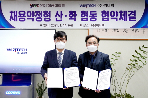 영남이공대가 실무지식을 겸비한 전문직업인 양성을 위해 (주)위니텍과 산·학 협동 협약을 체결했다.협약식에는 영남이공대 박재훈 총장과 박만교 부총장, 최중섭 교수, ㈜위니텍 추교관 대표이사, 이창재 이사, 김창욱 경영지원실장, 임정진 HR운영팀장 등이 참석했다. 협약에 따르면 양 기관은 ▲공동연구 및 기술정보 교환 ▲학생들의 실무능력을 위한 현장실습 및 인턴십 기회 제공 ▲CEO 및 임직원들의 특강 진행 ▲채용기준에 충족하는 졸업생 채용 등을 약속했다.위니텍은 '사람을 위한 테크놀로지'라는 모토로 1997년에 설립돼 재난·안전 분야의 전문성과 ICT기술 역량을 기반으로 통합재난관리시스템, 통합관제시스템 및 해양관제시스템 등의 스마트시티 솔루션 서비스를 제공하고 있다.박재훈 총장은 "4차 산업혁명 시대에 맞춰 지역 기반의 ICT대표 기업인 위니텍과 협약을 체결해 뜻깊다"면서 "양 기관의 활발한 상호교류를 통해 정보통신기술 융복합분야를 중심으로 한 전문성 및 실무능력을 갖춘 전문직업인 양성에 힘쓰겠다"고 했다.