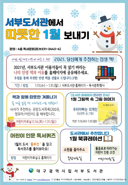 대구 서부도서관이 지난 13일부터 지역 주민의 따뜻한 겨울나기를 위해 온·오프라인 독서문화행사를 진행 중이다.주요 행사는 ▲2021 당신에게 추천하는 인생책 ▲책과 함께 따뜻한 겨울나기 ▲온라인 그림책 속 그림 이야기-우리 아빠는 외계인 등이다.2021 당신에게 추천하는 인생책은 나의 인생책을 꼽은 이유를 홈페이지에 게시하면 이중 3명을 추첨, 자신의 인생책을 지인에게 선물할 수 있도록 선물 포장해 증정한다.책과 함께 따뜻한 겨울나기는 겨울방학을 맞이한 어린이들이 책으로 따뜻한 방학을 보낼 수 있도록 사서가 직접 추천하는 도서목록을 배부한다.온라인 그림책 속 그림 이야기는 어린이들이 홈페이지를 통해 그림책 속 원화를 볼 수 있는 행사다.이인숙 관장은 "도서관에서 준비한 온·오프라인 행사로 책 읽는 즐거움을 다시 느낄 수 있는 겨울을 보내시길 바란다"고 말했다.