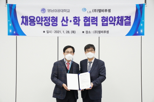 영남이공대는 지난 28일 (주)엘비루셈 회의실에서 채용약정형 산학협력 협약(MOU)을 체결했다고 29일 밝혔다.이날 협약식은 ㈜엘비루셈 구미본사 산업현장 방문으로 진행됐다. 영남이공대 박재훈 총장과 박만교 부총장, 손기복 교수, 이은희 팀장, ㈜엘비루셈 신현창 대표, 허성환 실장, 임정호 책임 등이 참석했다. 양 기관은 ▲학생들의 실무능력을 위한 현장실습 ▲임직원들의 특강 진행 ▲취업 정보 교류 ▲채용선발 기준에 충족하는 전문 인력 채용 등을 약속했다.기타 구체적인 사항은 추후 상호 협의해 시행하기로 했다. ㈜엘비루셈은 평판디스플레이의 핵심부품인 Driver IC와 광케이블(AOC) Connector을 생산하고 반도체 Bonding 및 Test 기술 등 핵심역량을 기반으로 한 디스플레이 반도체부품 전문 기업으로 최고의 품질과 성능으로 많은 사람들이 쉽고 편리하게 첨단 디스플레이를 이용하도록 돕고 있다. 박재훈 총장은 "이번 협약은 디스플레이 반도체부품 시장을 선도하는 전문 기업과 직업교육 중심대학의 실질적인 업무 협력으로 우수 전문직업인력 양성의 좋은 계기가 될 것이다”며 “산업체에서 필요로 하는 전문직업 교육 프로그램 운영을 통해 학생들의 현장실무 능력을 향상시키고 미래 산업에 적합한 인재 양성을 위해 노력하겠다”고 말했다.