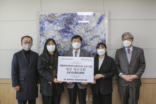 계명문화대 학생자치단체가 지난 3일 (사)계명문화1퍼센트사랑의손길에 성금 1000만원을 기부했다.전달된 성금은 경제적 어려움을 겪는 재학생과 지역 소외계층 이웃들을 위한 진료비, 식비지원, 장학금 등 사회공헌사업에 사용될 예정이다.(사)계명문화1퍼센트사랑의손길은 계명문화대 교직원들의 자발적 참여로 봉급의 1%를 기금으로 조성해 재학생과 지역사회에 사랑을 전하는 사단법인으로 박승호 총장이 이사장을 맡고 있다.심다은 총학생회장은 "학생자치단체 임원들이 뜻을 모아 성금을 전달하게 됐다"며 "최근 코로나19 등으로 인해 어려움을 겪고 있는 학우들과 이웃에 조금이나마 도움이 되길 바란다"고 말했다.
