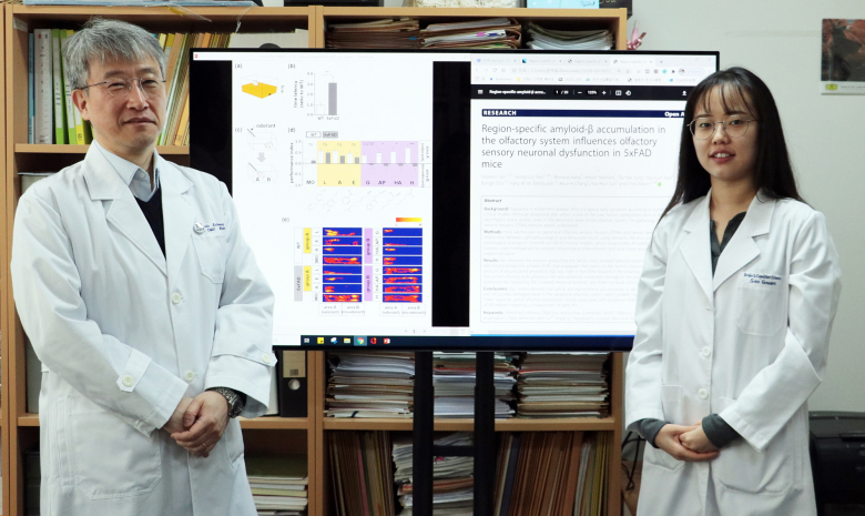 또 해당 동물의 후각신경계 영역 중 ‘외측 비갑개로부터 배쪽 후각구 영역’에서 알츠하이머 치매의 대표 병변인 베타아밀로이드의 축적이 특히 높은 것을 확인했다. 아울러 연구팀은 후각구의 신경연결부위를 지도화하고 수치를 부여하는 새로운 분석법을 통해 치매 초기에 후각신경세포의 퇴화와 재생이 반복되는 비율이 무너지면서 축적된 베타아밀로이드가 후각신경세포 소실에 영향을 주는 것을 확인했다. 이번 연구는 대뇌가 손상돼 후각신경계가 소실되는 것이 아닌, 질병 초기부터 병변이 축척돼 후각기능이 소실 될 수 있음을 밝혔다는 점에서 의의가 있다.