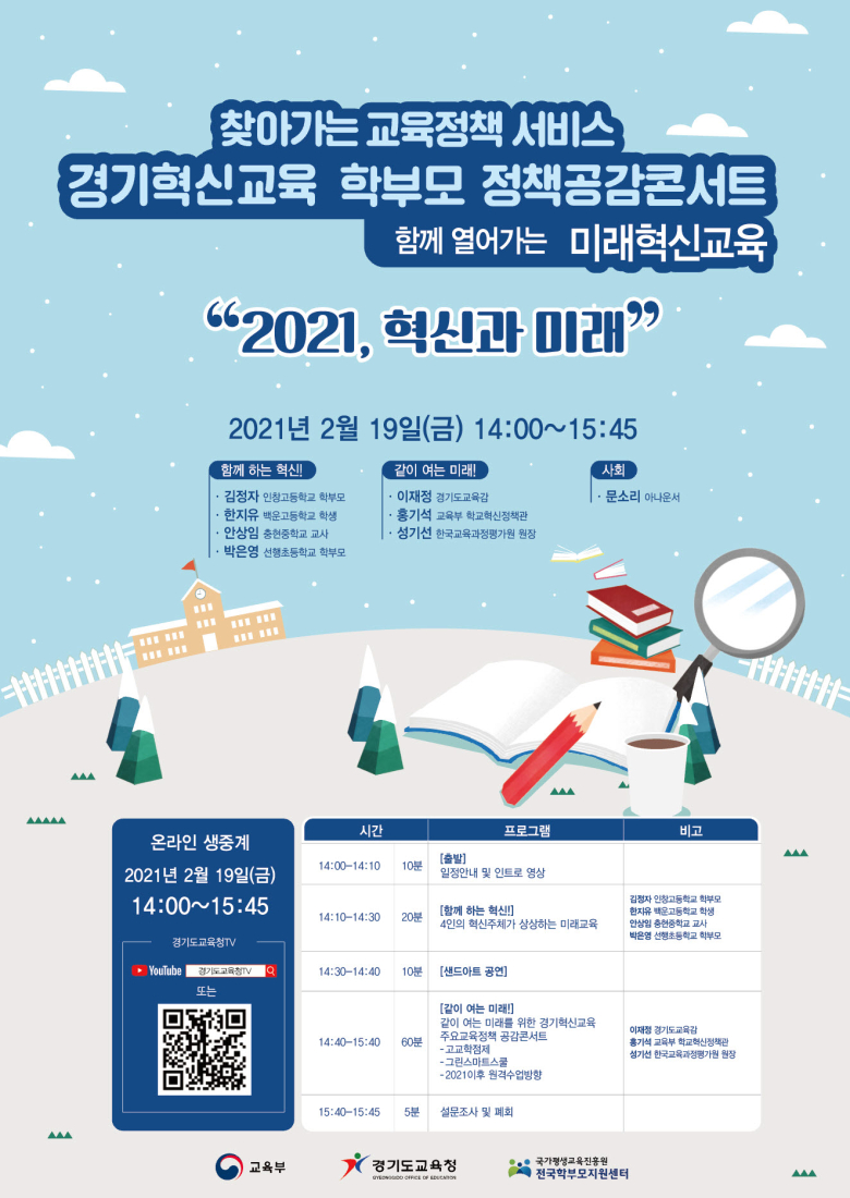 경기도교육청은 19일 온라인으로 ‘학부모 혁신교육 정책 공감 콘서트’를 연다고 18일 밝혔다.이번 행사는 교육부가 주최하고, 도교육청과 국가평생교육진흥원 전국 학부모지원센터가 공동으로 주관한다.공감 콘서트는 ‘2021, 혁신과 미래’를 주제로 1부에서 학부모, 학생, 교사가 저마다 상상하는 미래와 혁신교육에 대한 이야기를 나눈다.이어 교육부 홍기석 학교혁신정책관과 성기선 한국교육과정평가원장이 경기교육 담당자와 함께 ▲새로운 학력관과 교육 패러다임 ▲고교학점제 ▲그린스마트스쿨 ▲원격수업 방향 등을 중심으로 학부모와 소통한다.이밖에도 코로나19 이후 달라진 교육환경의 변화와 각종 정책을 안내하고, 공감 콘서트에 참여한 학부모들의 다양한 의견도 듣는다.공감 콘서트는 도교육청 유튜브 채널을 통해 누구나 참여할 수 있으며, 실시간으로 참석자들과 질의응답도 진행한다.참여를 희망하면 19일 오후 2시부터 유튜브에서 ‘경기도교육청 TV’에 실시간으로 접속하면 된다.도교육청 김진만 학교정책과장은 "코로나19로 인해 급격히 달라진 교육환경에서 경기혁신교육도 새로운 도약의 계기를 맞았다"며 "학부모들이 지닌 자녀 교육에 대한 다양한 고민을 공유하고, 이를 해결할 수 있는 새로운 방안을 찾는 뜻 깊은 시간이 될 것으로 기대한다"고 말했다.