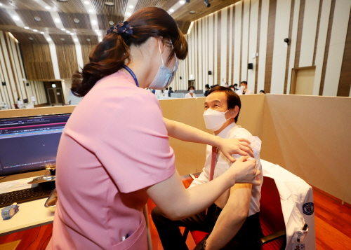 계명대 동산병원 코로나19 백신 예방접종이 8일부터 12일까지 병원 대강당에서 진행된다. 대상은 의료진 및 환자대면부서 직원이며, 백신 종류는 아스트라제네카(AZ)다. 접종 장소인 대강당에는 코로나19 확산을 미연에 방지하고 혹시 모를 이상 반응 환자 관리를 위해, 30분 단위로 20명씩 입장하도록 했다. 첫날 접종 예상 인원은 270명 가량이다. 예방접종은 대강당에 들어서며, ▲접수 ▲진료 ▲접종 ▲관찰대기석 ▲예진표 제출 단계로 차례대로 진행된다. 한편, 직원들의 백신 부작용에 대한 우려를 불식하기 위해 이세엽 동산의료원장이 솔선수범해 첫 번째로 접종을 받았다. 이어 조치흠 동산병원장, 박숙진 간호부원장, 한성욱 진료부원장 등 운영진들이 백신 주사를 맞았다. 이세엽 동산의료원장은 예방접종을 마친 뒤 “백신 주사를 맞은 후 현재까지 특별한 통증이나 불편 사항은 없다”며, “의료진들이 코로나19 감염으로 인한 환자진료에 차질이 없기를 바라며, 하루 빨리 백신 접종이 확대돼 모두 평범한 일상으로 돌아가길 기대한다”고 소감을 전했다.