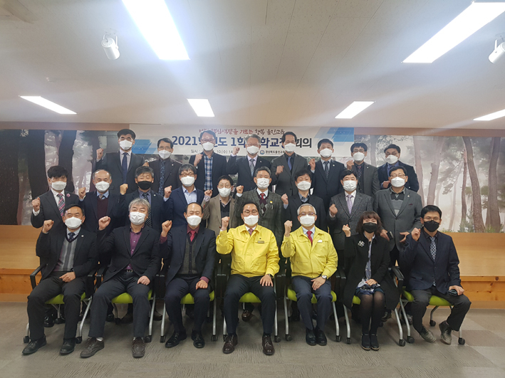 울진교육지원청(교육장 권오진)은 10일 교육지원청대회의실에서 초·중등 학교장이 참석한 가운데 '미래 핵심역량을 기르는 행복 울진교육' 실현을 위한 학교장 회의를 개최하였다. 이번 학교장 회의는 반부패·청렴 서약, 새로 오신 교육장 및 학교장 소개, 교육지원청 직원 소개, 미래 핵심역량을 기르는 행복 울진교육 2021 주요정책 추진내용 및 업무, 교육장 회의 내용 전달 순으로 이루어졌다. 반부패·청렴 서약에 다짐한 학교장들은 공직사회의 관행적 부패를 척결하고 공정한 사회를 조성하는데 모범이 될 것을 다짐하였다. 권오진 교육장은 인사말에서 '미래 핵심역량을 기르는 행복 울진교육' 실현을 위한 포부를 밝히고 올 한해 무엇보다도 학교업무 정상화에 앞장서 교원이 수업 및 학생 생활지도에 전념할 수 있는 교육 환경조성에 학교장의 역량 발휘를 당부하였다.