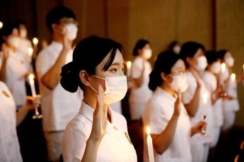 영남이공대는 12일 간호대학이 천마스퀘어 2층 시청각실에서 '제36회 나이팅게일 선서식'을 가졌다고 밝혔다.나이팅게일 선서식은 2년간의 기본 이론교육을 마친 간호학과 학생들이 본격적으로 임상실습을 나가기 전 간호인으로서 나이팅게일의 숭고한 간호 정신을 이어 받을 것을 서약하는 행사다.이날 선서식은 코로나19 확산방지를 위해 최소 인원만 참석한 가운데 거리두기 및 방역지침을 준수하며 진행됐다.선서식을 마친 간호학과 학생들은 3학년 1학기부터 4학년 2학기까지 실습을 통해 미래의 전문직 간호사로서 첫걸음을 시작한다.이재용 총장은 "코로나 방역에 최일선의 수호자로 칭송받는 의료인으로 임상실습 기간 중 방역지침을 철저하게 지켜줄 것을 부탁한다"며 "나이팅게일의 숭고한 정신과 각오를 이어받아 존경받고 사랑받는 간호사가 돼 건강한 모습으로 대학에 복귀하길 바란다"고 말했다.