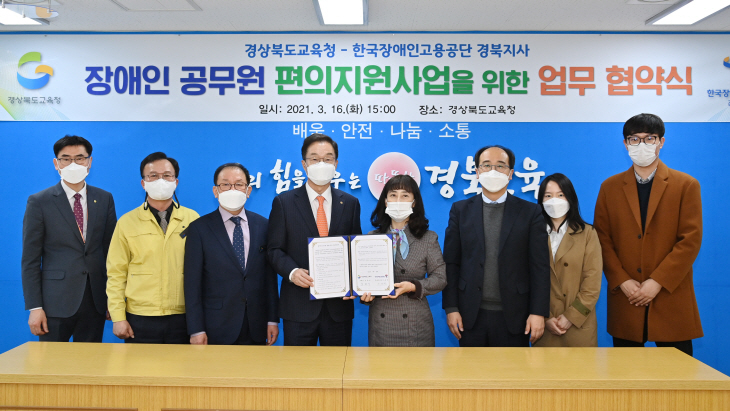 경북교육청이 16일 한국장애인고용공단 경북지사와 장애인공무원의 근로지원인 및 보조공학기기 지원을 위해 ‘장애인 공무원 편의지원 사업 업무 협약’을 체결했다.