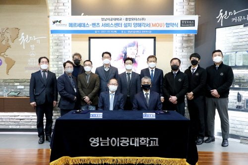 영남이공대는 지난 18일 중앙모터스(주)와 천마스퀘어 2층 천마역사관에서 메르세데스-벤츠 서비스센터 설치를 위한 협약(MOU)을 체결했다고 19일 밝혔다.이날 협약식에는 영남이공대 이재용 총장, 권기홍 교학부총장, 박만교 대외협력부총장, 권용현 기획처장, 중앙모터스(주) 이종기 대표이사, 신동덕 본부장 등이 참석했다.양 기관은 이번 협약 체결을 통해 전국 최초로 교내에 메르세데스-벤츠 서비스센터를 설치하기 위한 협력관계를 구축했다.영남이공대는 메르세데스-벤츠 서비스센터를 설치할 수 있도록 자동차기술센터 및 산학협력관 일부 공간을 제공한다. 중앙모터스는 메르세데스-벤츠 서비스센터 개소를 위한 인가 및 설치 등 제반 업무를 담당하고 추진한다. 또 재학생들의 현장실습과 교육을 위해 적극 협조한다. 세부사항은 추후 상호협의를 통해 결정하기로 했다.중앙모터스는 대구·경북 메르세데스-벤츠 공식 딜러사로서 32년간 최고의 차를 높은 수준의 서비스로 제공하고 있는 기업이다. 메르세데스-벤츠 교육프로그램 및 사회공헌 프로그램 운영 등 전문인력 양성 및 지역사회 공헌을 위해 꾸준히 노력해왔다.