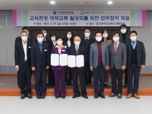 OU)을 체결했다.이번 협약은 교육현장에서 학생 및 기관교류의 실제경험을 가진 대구교육청과 21개 회원국의 네트워크를 통해 축적된 국제교육교류협력의 경험을 가진 APEC국제교육협력원이 협력해 대구 교육의 국제화를 촉진할 목적으로 체결됐다.주요 협력분야는 ▲교육현장 국제화의 저변 확대를 위해 양 기관 및 직속기관을 포함한 포괄적 국제교육개발협력활동 전개 ▲교육현장의 국제화를 위한 기반(학교네트워크, 국제교육협력 DB) 조성 ▲국제교육개발협력 관련 정보 및 네트워크 공유 ▲국제교육개발협력 사업 공동 발굴 및 수행, 양 기관 프로젝트 상호 지원 ▲국제교육개발협력 분야 인식 제고와 역량 강화를 위한 공동 노력 ▲국제교육개발협력 사업성과를 국내외 교육현장과 공유 및 확산하는 공동 노력 등이다.강은희 교육감은 "대구교육청과 APEC국제교육협력원의 이번 협약은 대구학생의 미래역량 강화에 큰 힘이 될 것"이라며 "APEC국제교육협력원과 협력을 통해 대구교육이 세계 속의 교육으로 나아가길 희망한다"고 말했다.