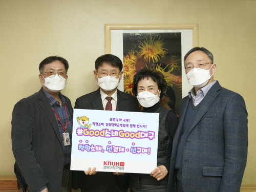 김용림 경북대병원장이 지난 23일 '대구시 착한 소비 운동' 챌린지에 동참했다.이 챌린지는 코로나19 장기화로 인한 소비 위축과 경기침체를 극복하기 위한 캠페인이다.대구시 주관으로 장기화된 코로나 사태 극복과 민생경제 회복을 위해 착한소비, 선결제, 선구매에 동참함으로서 침체된 지역경제를 활성화시키겠다는 취지로 진행되고 있다.김 병원장은 "이번 착한 소비 운동 챌린지가 병원 인근 소상공인과 자영업자들에게 작은 도움이 되길 바란다"며 "우리 병원도 코로나19 확산방지와 치료를 위해 총력을 기울이겠다"고 밝혔다.홍원화 경북대 총장과 이수환 대구농협 본부장의 추천을 받은 김 병원장은 다음 주자로 조영래 대구보훈병원장과 김동세 제50보병사단장을 지목했다.한편, 경북대병원은 병원 인근 음식점을 방문한 뒤 챌린지 동참 사진을 경북대병원 공식 SNS에 공개했다.