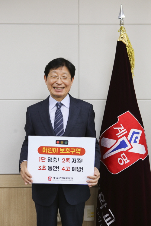 박승호 계명문화대 총장이 29일 '어린이 교통안전 릴레이 챌린지'에 동참했다.어린이 교통안전 릴레이 챌린지는 어린이 보호를 최우선으로 하는 교통문화 정착과 어린이 보호구역 내 교통사고 예방에 대한 국민적 공감대를 형성하기 위해 행정안전부가 추진한 캠페인이다.캠페인은 국민 아이디어 공모로 선정된 어린이 교통안전 표어 '1단 멈춤! 2쪽 저쪽! 3초 동안! 4고 예방!’ 피켓을 들고 인증샷을 촬영해 SNS에 공유한다.박 총장은 이날 표어가 담긴 피켓을 들고 인증샷을 촬영 후 대학 공식 SNS에 공유했다.박 총장은 "국가의 미래이자 희망인 어린이들의 안전을 위해 우리 어른들이 앞장서야 한다"며 "어린이들을 위한 안전한 교통 환경 마련을 위해 많은 관심과 참여를 바란다"고 했다.