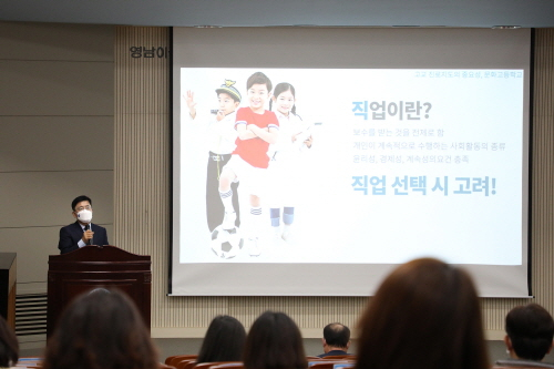 영남이공대는 지난 7일 오후 컴퓨터정보관 시청각실에서 '입시홍보와 진로지도' 특강을 가졌다고 8일 밝혔다.이번 특강은 박홍근 문화고 교장을 초청해 학령인구 감소에 따른 입시 홍보 방법을 모색하고, 급변하는 교육 및 대학환경에 따른 고교 진로지도 방안을 논의하기 위해 마련됐다.박 교장은 ▲진로지도 계획 ▲교육환경의 변화 ▲대학환경의 변화 ▲진로지도교육 ▲고교학점제 ▲입시홍보 ▲4년제와 전문대 등 변화하는 교육환경에 촛점을 맞춘 지도방안과 입시홍보 방안 등에 대해 설명했다.박 교장은 특강에서 "인구감소로 변화하는 교육환경에 맞서기 위해선 전문대학의 취업 중심 학과별 홍보가 중요하다"며 "학생들과의 직접적인 면담을 통한 개인별 맞춤 지도와 학과 매칭이 필요하다"고 강조했다.영남이공대 신승훈 입학처장은 "학생들의 니즈와 고교 현장의 목소리를 입시 전형에 신속하게 반영할 수 있도록 노력하겠다"며 "세계적 수준의 직업교육이라는 우리 대학의 강점을 통해 해마다 어려워지는 입시환경과 외부변화에 흔들리지 않고 이 위기를 돌파해나가겠다"고 말했다.
