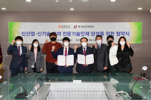 대구보건대는 지난 9일 소회의실에서 로킷헬스케어와 신산업·신기술 분야 전문기술인재 양성을 위한 업무제휴 협약식(MOU)을 체결했다고 12일 밝혔다.이날 협약식엔 로킷헬스케어 구용남 사장, 바이오지능전략사업팀 김동준 팀장, 이지해 팀장과 장상문 대외부총장, 김지인 산학협력단장, 임상병리과 학과장 안승주 교수 등 양 기관 관계자 10여명이 참석했다.이번 협약으로 양 기관은 ▲신산업분야 전문기술 인력양성 전략 공유와 협력 ▲신산업 분야 교육과정 개발과 교육 인프라 구축 ▲전문인력 취업 등을 적극 추진한다.대구보건대는 이번 협약으로 신산업분야 교육사업을 성공적으로 추진하고 특화된 전문기술인재를 양성해 지역 산업 활성화에 크게 기여할 것으로 기대했다.남성희 대구보건대 총장은 "이번 협약은 신사업·신기술 분야 전문 인력양성의 발판이 될 것"이라며 "4차 산업혁명 시대를 이끌어갈 신산업 분야의 전문기술인재 양성에 모든 지원과 협력을 아끼지 않을 것이다"고 말했다.