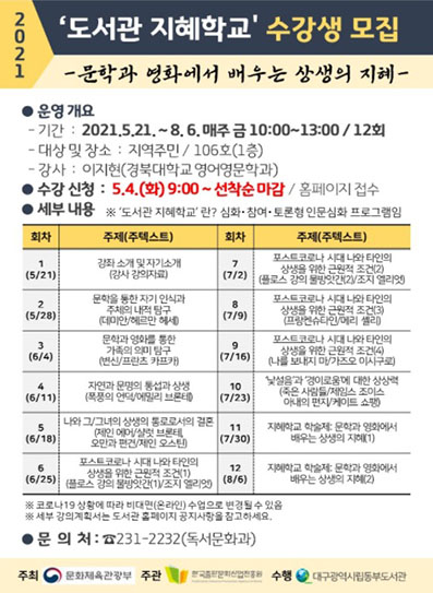 대구 동부도서관이 4일 오전 9시부터 '도서관 지혜학교' 수강생을 선착순 모집한다.동부도서관에 따르면 '도서관 지혜학교'는 지역의 인문대학과 연계, 인문학을 통해 삶의 지혜를 찾고자 하는 신중년 세대를 대상으로 한 심화형·참여형·토론형 인문 심화 프로그램이다.'문학과 영화에서 배우는 상생의 지혜'를 주제로 문학작품 및 관련 영화를 감상하고, 이를 통해 문학적 상상력을 함양해 문학에 잠재된 나와 타자, 세상과의 관계를 회복하는 상생과 성장의 지혜를 배우게 된다.강의는 이지현 경북대 영어영문학과 교수가 맡는다.