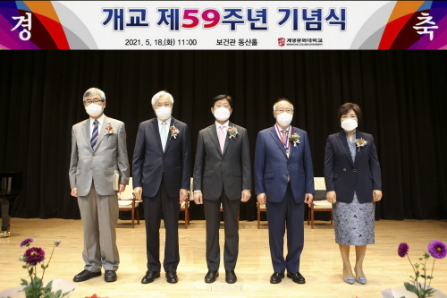 계명문화대는 18일 보건관 동산홀에서 개교 59주년 기념식을 개최했다.개교 기념식은 박승호 총장, 김남석 학교법인 계명대학교 이사장, 정순모 목사, 김창옥 총동창회장 등이 참석한 가운데 코로나19 방역수칙과 사회적 거리두기를 준수해 간소하게 진행됐다.이날 교직원 포상에서 ▲식품영양조리학부 이영순 명예교수가 ‘계명금장’ ▲아동보육과 손완호 교수, 뷰티코디네이션학부 이유종 교수가 ‘30년 근속상’ ▲패션학부 장경혜 교수, 공연음악학부 김정화 교수, 생활체육학부 김홍수 교수, 총무부 신기혁 부장, 국제교육행정팀 김동현 팀장, 교양·직업교육과정지원센터 김은영 선생이 ‘20년 근속상’을 각각 수여 받았다.또 ▲교수학습지원팀(부서), 산학협력팀(부서), 대외협력팀 문정남 팀장(개인)이 ‘공로상’ ▲학생지원팀 김현영 계장, 진로취업지원팀 신혜령 선생이 ‘모범상’ ▲호텔항공외식관광학부 김태문 교수(취업지도분야), 소방환경안전과 김재현 교수(산학협력분야)가 ‘계명문화상’ ▲산업디자인과 박성배 교수(학술진흥분야), 경찰행정과 박영화(인재양성분야) 교수가 ‘교육부장관 표창’을 수상했다.계명문화대 박승호 총장은 기념사에서 “최근 학령인구 급감으로 암울한 이야기들이 난무하지만 우리 구성원들이 집단지성을 활용해 함께 노력한다면 이 위기를 이겨내고 직업교육 선도대학으로 우뚝 설 수 있다”고 강조했다.이어 “우리는 학생들이 성장하도록 교육할 무한책임을 지고 있는 만큼 이러한 어려운 시기일수록 정성을 다해 학생들을 지도하고 지원하는 한편 교육혁신에도 박차를 가하는 등 학생들의 성공적인 교육을 위해 최선을 다해 주길 바란다”고 말했다.한편 계명문화대는 1962년 2개 학과로 시작해 현재 9개 학부(22개 전공), 20개 학과, 학사학위 전공심화과정 9개 학과를 운영 중이며, 지금까지 9만1176명의 졸업생을 배출한 직업교육 선도대학으로 성장했다.