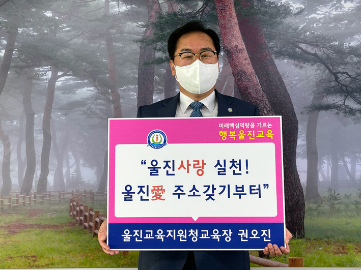울진교육지원청 권오진 교육장이 3일 저출산·고령화에 따른 울진군의 인구 감소에 따라 ‘울진 사랑 실천 울진愛 주소 갖기부터’ 캠페인에 동참했다. 캠페인은 울진에 거주하면서 타 시·군에 주소를 두고 있는 시민들의 주소 이전을 독려하고 5만 인구 회복의 필요성을 주민들에게 전달해 동참 분위기를 이끌어내기 위해 시작된 것이다. 울진군은 실질적인 인구 유입을 위해 전입자에게 찾아가는 주소 이전 서비스 등 다양한 혜택을 지원하고 있다.