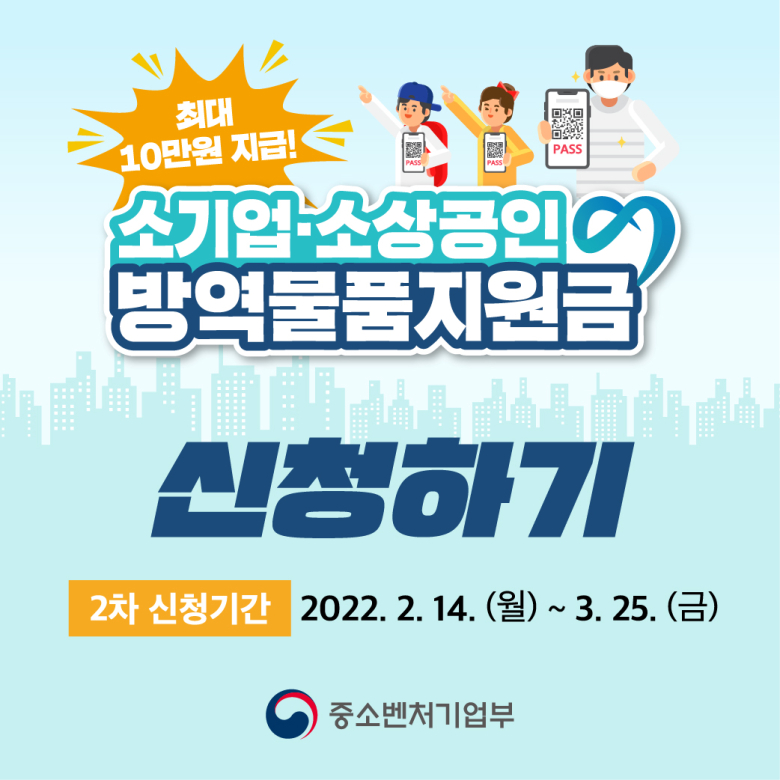 지난해 12월 3일 이후 구매한 QR코드 확인 단말기, 손세정제, 마스크, 체온계, 소독기, 칸막이 등 방역 관련 물품의 구매 영수증을 업로드하면 업체당 최대 10만 원까지 지원한다. 다수사업체인 경우 각 사업체별로 지원금액을 산정한다.연장된 방역물품지원금 2차 신청은 안동시청 홈페이지 배너를 통해 온라인으로 신청할 수 있으며, 첨부서류로 사업자등록증, 통장사본, 방역물품 구매 영수증 사진을 각각 업로드해 제출하면 된다. 자세한 내용은 중소벤처기업부, 소상공인시장진흥공단, 안동시청 홈페이지 공고문을 통해 확인할 수 있다.시 관계자는 “방역물품지원금이 방역패스 의무적용으로 어려움을 겪고 있는 소상공인들에게 작게나마 힘이 되길 바라며, 더 많은 소상공인들이 지원받을 수 있도록 지속적으로 홍보하겠다”고 전했다.