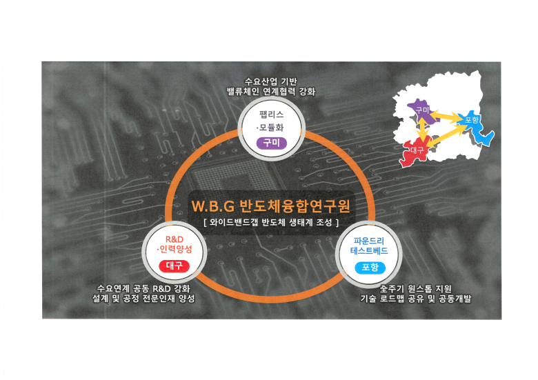 경북도는 WBG반도체 생태계 조성을 위해 와이드밴드갭 반도체 소재별 제조 플랫폼을 구축해 국내 유일의 SiC(탄화규소) 웨이퍼 생산․공급업체인 KEC, 예스파워테크닉스 등과 지방 권역형 협력체계를 마련한다.