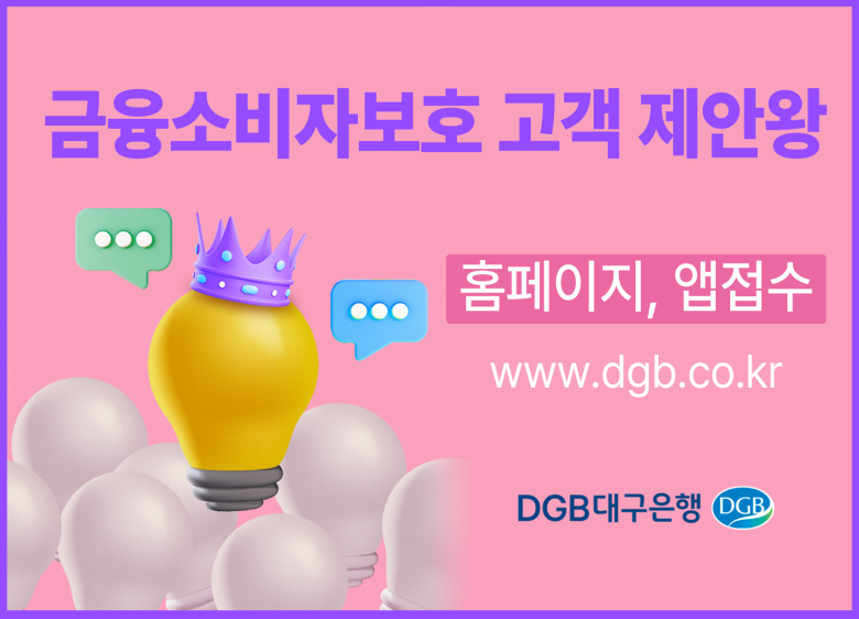 DGB대구은행이 은행 제도와 관행개선에 필요한 아이디어를 접수 받는 ‘고객 제안왕 ’ 시즌2를 진행한다.22일 대구은행에 따르면 이번 이벤트는 지난해 연중 운영되던 금융소비자보호 아이디어 공모전 ‘바꿔서, 달라지겠습니다!’ 후속이다. 고객 누구나 올 연말까지 대구은행 홈페이지와 앱을 통해 자유롭게 의견을 개진하는 방식으로 진행된다.금융소비자 관점에서 편리성을 제고하고 소비자 보호 활동 개선을 위한 다양한 의견이라면 무엇이든 제안할 수 있다. 고객 관점 은행 업무 관행 개선, 비대면 금융거래(IM뱅크, 인터넷뱅킹) 불편사항 개선의견을 비롯해 전기통신금융사기 예방 방안, 금융취약계층 보호를 위한 의견 등이 있다.지난번 공모전에서 착안해 실제 은행 서비스 제고로 이어진 사례로는 ▲DGB 마스코트 단디·똑디 활용 보이스피싱 예방 동영상 제작 ▲고령자와 장애인 인구가 많은 지역의 영업점 운영 방안에 대한 제안 ▲인공지능(AI)이 적합한 상품을 고객에게 제안할 수 있는 제도 등이 있다.올해 연중 우수 의견을 게시한 고객에게는 상품을 추첨 증정할 예정이다. 제안 건수, 개선효과, 노력도, 실용성 등에 대한 종합적 평가를 거쳐 분기별로 30명을 선정해 스타벅스 아메리카노 기프티콘 1매를 지급한다. 또 연간 1등인 ‘고객 제안왕’ 1명에게는 신세계 상품권 30만원과 2등인 ‘고객 제안상’ 2명에게는 신세계 상품권 20만원을 각각 전달한다.참여를 원하는 고객은 대구은행 거래 중 불편한 사항이나 개선이 필요한 부분에 홈페이지와 앱으로 응모할 수 있다.박성희 금융소비자보호 총괄책임자(CCO)는 "고객의 꾸준한 성원에 힘입어 매년 실시하는 고객제안 이벤트에 많은 고객들의 참여를 부탁하며 고객의 소중한 의견에 귀 기울이고 즉시 개선해 소비자보호 활동에 지속적으로 노력하겠다"고 밝혔다.