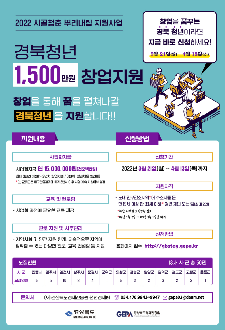의성군은 적극적인 청년 유입 정책으로 지방 소멸 위기를 극복하기 위해 올해 시골청춘 뿌리내림 지원사업 참여자를 모집하고 있다. 이 사업은 행정안전부 지역주도형 청년 일자리사업의 일환으로 지역의 자원을 활용하는 아이디어를 창업 지원을 통해 청년들의 안정적인 지역 정착과 경기 활성화를 도모하는 사업이다. 모집대상은 사업 공고일 기준 경북도 내 인구감소지역(의성군 외 15개소)에 주소지를 둔 만 19세~39세 이하의 미취업 청년으로 개인 또는 팀(최대 2인)단위로 참여가 가능하며, 모집기간은 이달 21일부터 4월 13일까지다. 공모결과 최종 선정자에게는 성공적인 창업을 위한 각종 교육과 맞춤형 컨설팅을 제공하며, 사업평가 결과에 따라 최대 2년차까지 청년 1인당 매년 1,500만원과 3년차에는 청년 채용 시 인건비를 지원한다. 참가를 희망하는 경북도 내 청년들은 의성군청이나 경상북도 경제진흥원 홈페이지를 통해 신청서를 다운로드 후 절차에 따라 신청하면 되고, 자세한 사항은 의성군 공지사항에서 확인할 수 있다. 김주수 의성군수는 “이번 사업이 창업의 꿈을 품고 우리 지역에 첫발을 내디디려는 청년들에게 디딤돌이 되기를 희망하며 반짝이는 아이디어와 젊음으로 지역을 활기차게 만들어주길 기대한다”라며 “우리 청년들이 심도있는 변화와 발전을 지속적으로 도모할 수 있도록 청년들에게 지원을 아끼지 않겠다”라고 전했다.