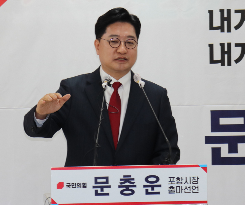 문충운 국민의힘 포항시장 예비후보는 29일 오전 포항시청 브리핑실에서 열린 출마회견에서 “오늘은 ‘자랑스런 대한민국의 경제도시 포항’의 위대한 부활을 선언하는 날로 ‘100만 도시 포항, 100년 경제 포항’을 향한 포항시민과의 위대한 대장정을 위해 이 자리에 나왔다”며 “‘내게 힘이 되는 포항, 내게 힘을 주는 시장’ 그런 포항과 시장을 바라는 시민의 열망과 기대에 부응해 나가겠다”며 지지를 호소했다.그는 이날 “지금은 디지털 대전환시대로 포항이 시대흐름에 적응하지 못한다면 50만 인구조차 지킬 수 없는 도시로 추락할 것”이라며 “세계적 인물 청암 박태준 회장은 이미 반세기 전에 포스코를 세워 포항을 대한민국 경제발전의 견인차 역할을 하게 했고, ‘100만 도시 포항, 100년 경제 포항’은 청암의 위대한 영광을 드높이는 포항의 비전으로 포항이 다시 대한민국 경제의 엔진이 되어야 한다”고 피력했다.