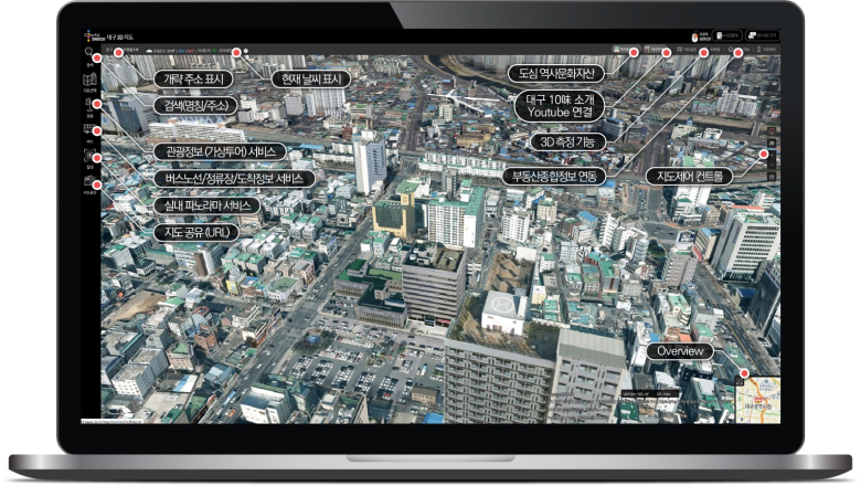 더불어 시민들이 많이 이용하는 반월당역, 중앙로역, 동대구역, 복합환승센터 등 주요 공공시설 8곳의 실내 공간 정보를 구축해 층별 실내 지도를 확인해 볼 수 있다.대구를 방문하는 관광객을 위해 가상관광 서비스를 제공하는 것은 ‘대구 3차원 지도’ 서비스만의 장점이며 도심권, 앞산권, 팔공산권 등 5개의 권역별 코스와 도심순환관광, 중구 골목투어 등의 주요 관광코스를 가상투어로 대구의 명소를 한눈에 내려다보듯이 그 지역을 미리 체험할 수 있다.또 3차원 지도를 자율 주행, 빅데이터의 3차원 분석, 교통량 및 에너지 사용 분석을 통한 미래 예측 등의 기본 데이터로 활용 중이고 민간포탈에서 제공하지 않는 토지대장과 실거래가 등의 부동산 정보를 제공한다.올해는 3차원 공간정보의 활용 확산을 위한 개방체계 구축, 이용 편의 제공을 위한 통합시스템 구성, 기능 및 시각적인 부분을 고도화할 계획이다.권오환 시 도시재창조국장은 “시민과 소통을 통해 서비스 기능을 개선하고 유용한 콘텐츠를 발굴해 3차원 공간정보와 플랫폼 품질 향상에 노력하겠다”고 말했다.